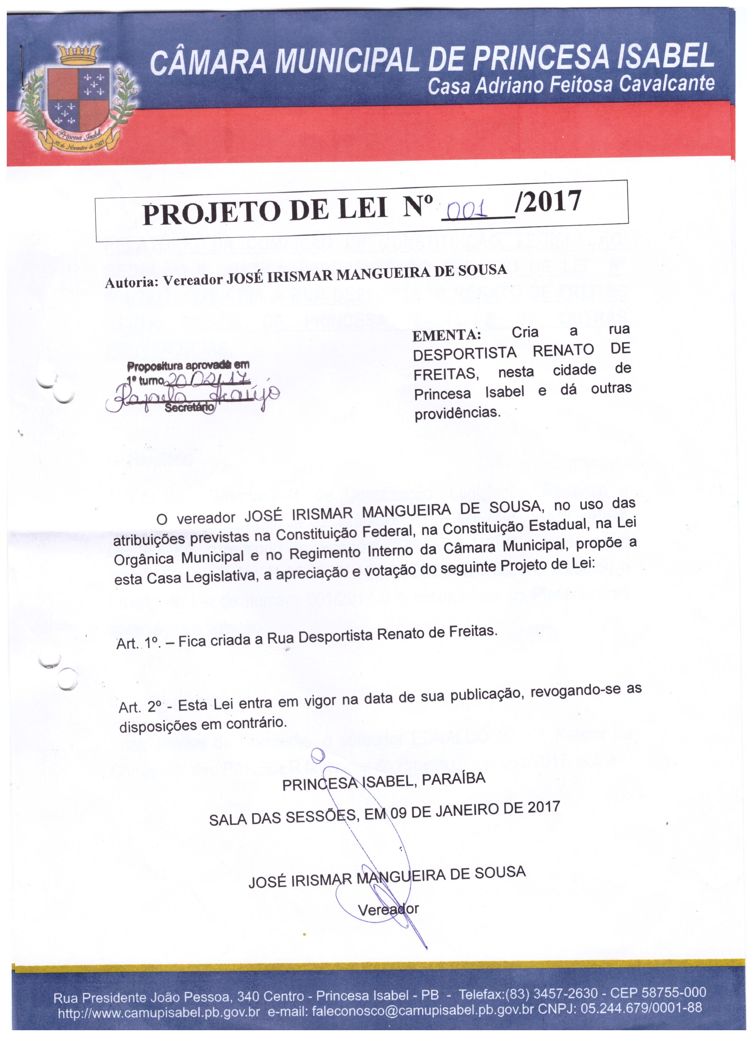 Projeto de Lei nº 01 - Autoria: Vereador Irismar Mangueira